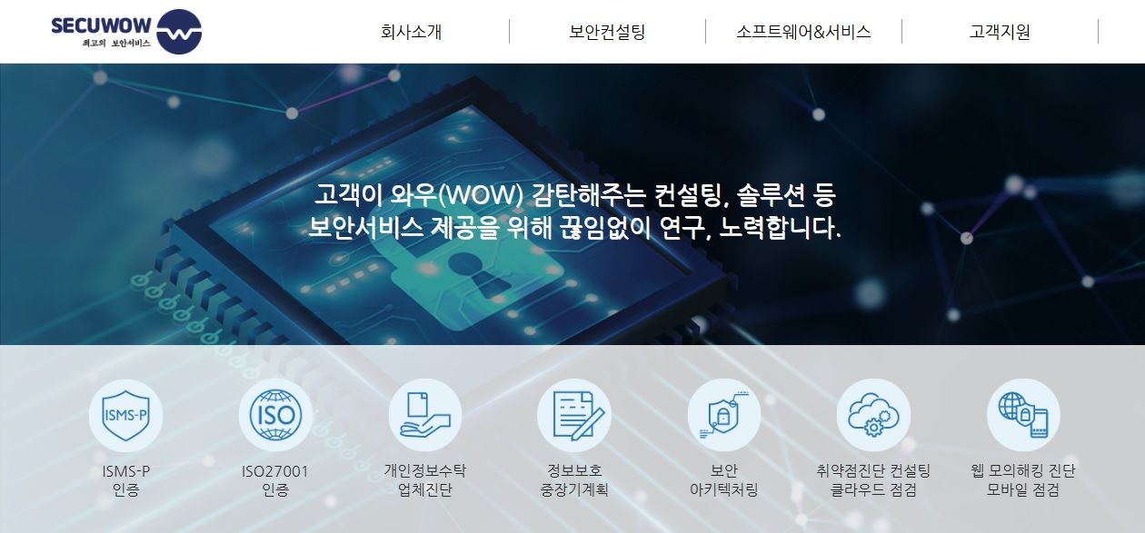 저희 시큐와우는 2020년 9월에 설립된 정보보호 컨설팅 전문기업입니다. 소프트웨어 개발 및 공급업, 정보보호컨설팅, 정보보호솔루션 제공 등 정보보호 사업 전반을 영위하고 있습니다.