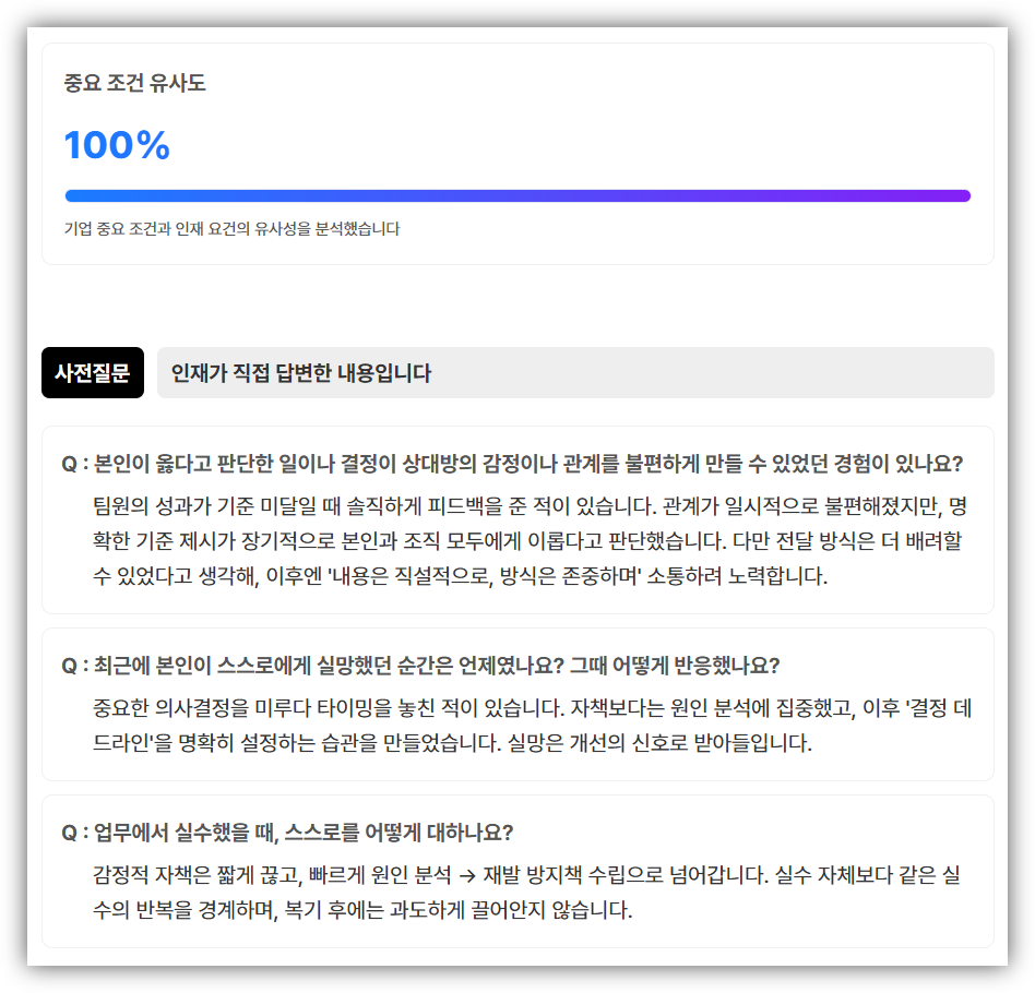 스타팅은 인터뷰 전에 사전 질문을 통해 후보자의 답변을 확인할 수 있어서, 인터뷰 전 단계에서 핏을 어느 정도 가늠할 수 있었습니다. 그래서 “이 후보는 어떤 강점으로 이 역할에 접근하는지”, “우리 환경에서 일할 때 어떤 방식으로 문제를 풀 가능성이 높은지” 같은 포인트를 미리 볼 수 있었습니다. 결과적으로 인터뷰를 하더라도 확인해야 할 질문이 더 정교해졌고, 애초에 방향이 크게 다른 경우는 인터뷰 전에 정리가 가능해져서 불필요한 인터뷰를 줄이는 데 도움이 됐습니다.